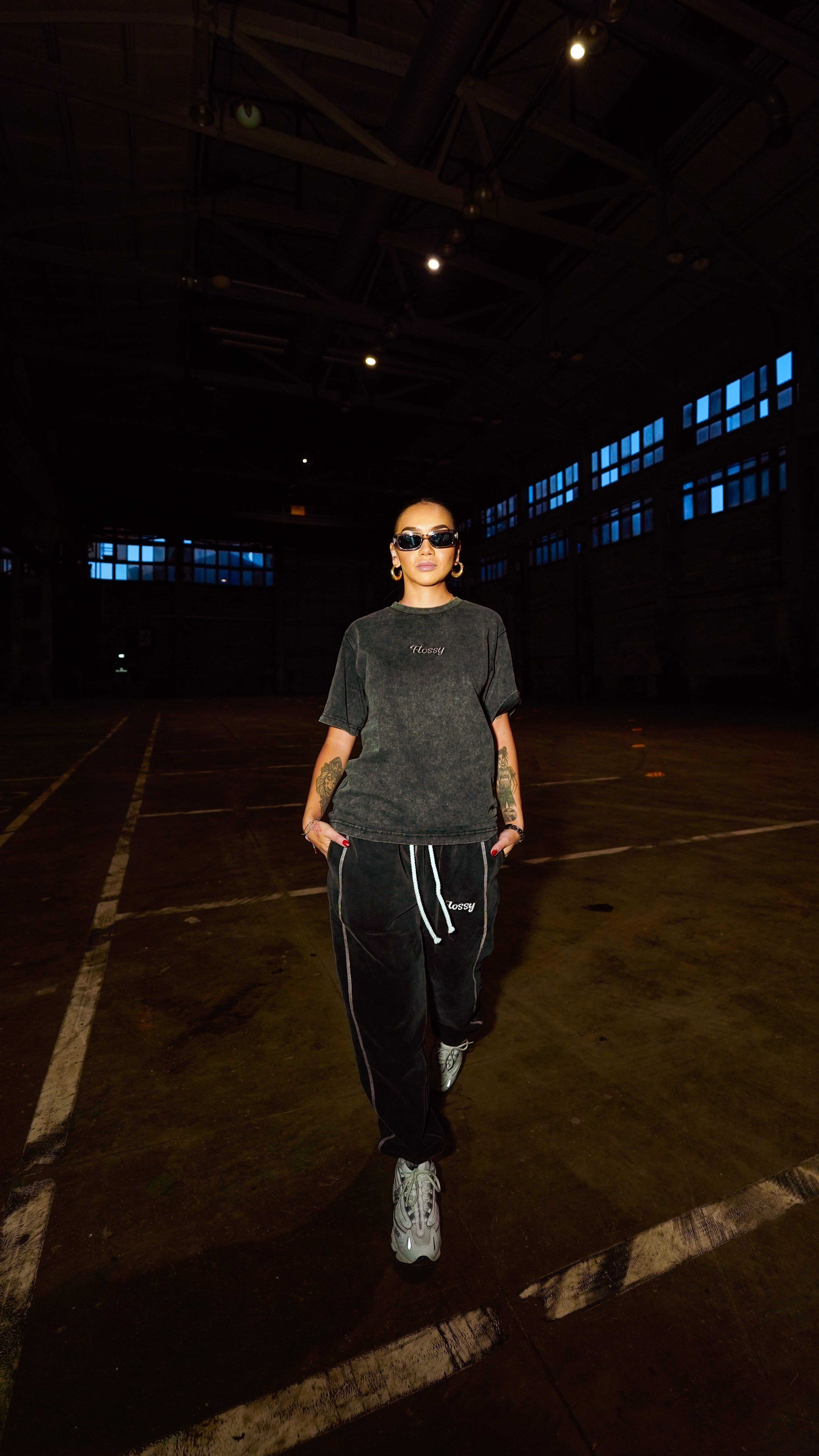 Tonal embroidered Flossy logo at center chest for a subtle finish